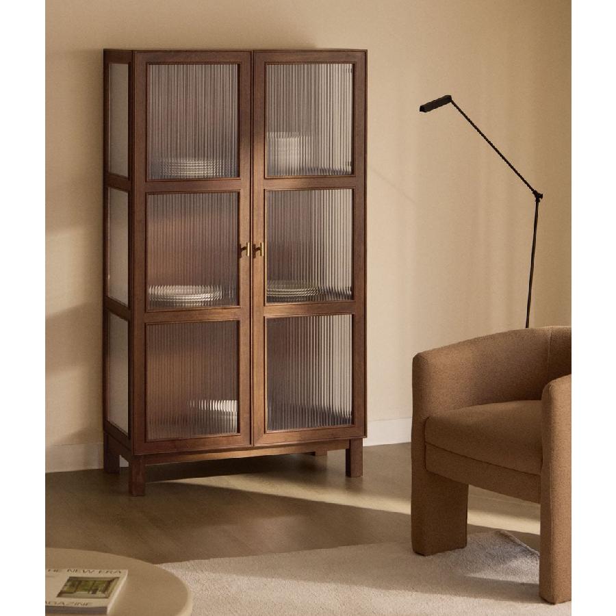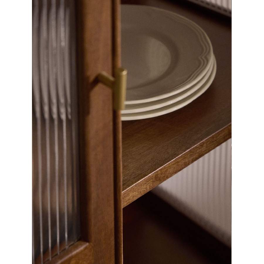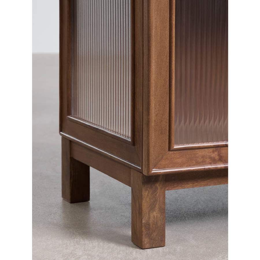 Vitrina elegante y funcional de madera de mango con acabado mate y puertas con vidrio templado estriado. Su estructura robusta realza las vetas naturales, mientras que sus puertas acristaladas permiten exhibir tus objetos con estilo. Una pieza ideal para salones o comedores que aporta carácter artesanal y un práctico espacio de almacenaje. Pertenece a la colección Signature de la marca Sklum.