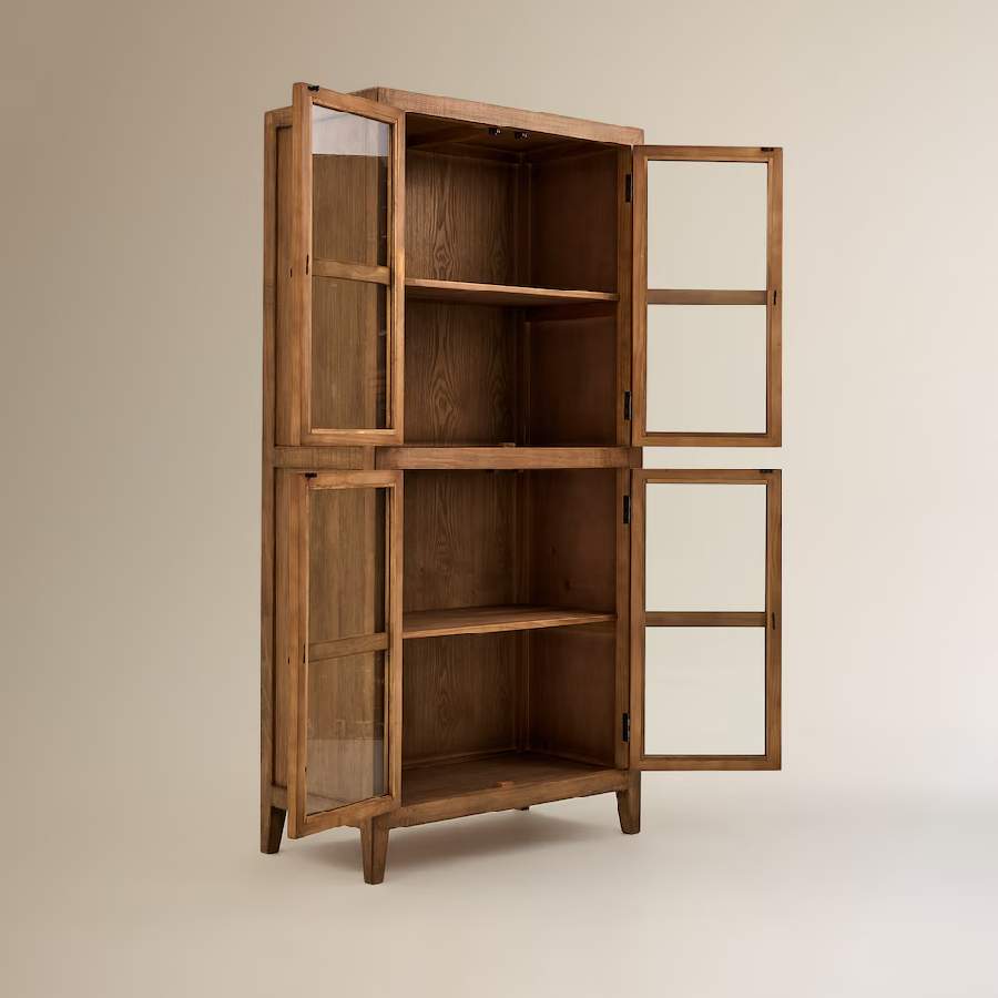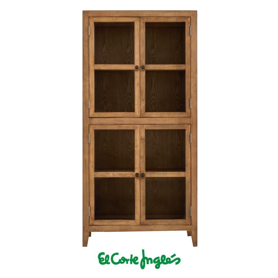 Vitrina robusta fabricada con madera maciza de pino reciclado. Está formada por dos cuerpos con dos puertas cada uno con una balda en su interior.