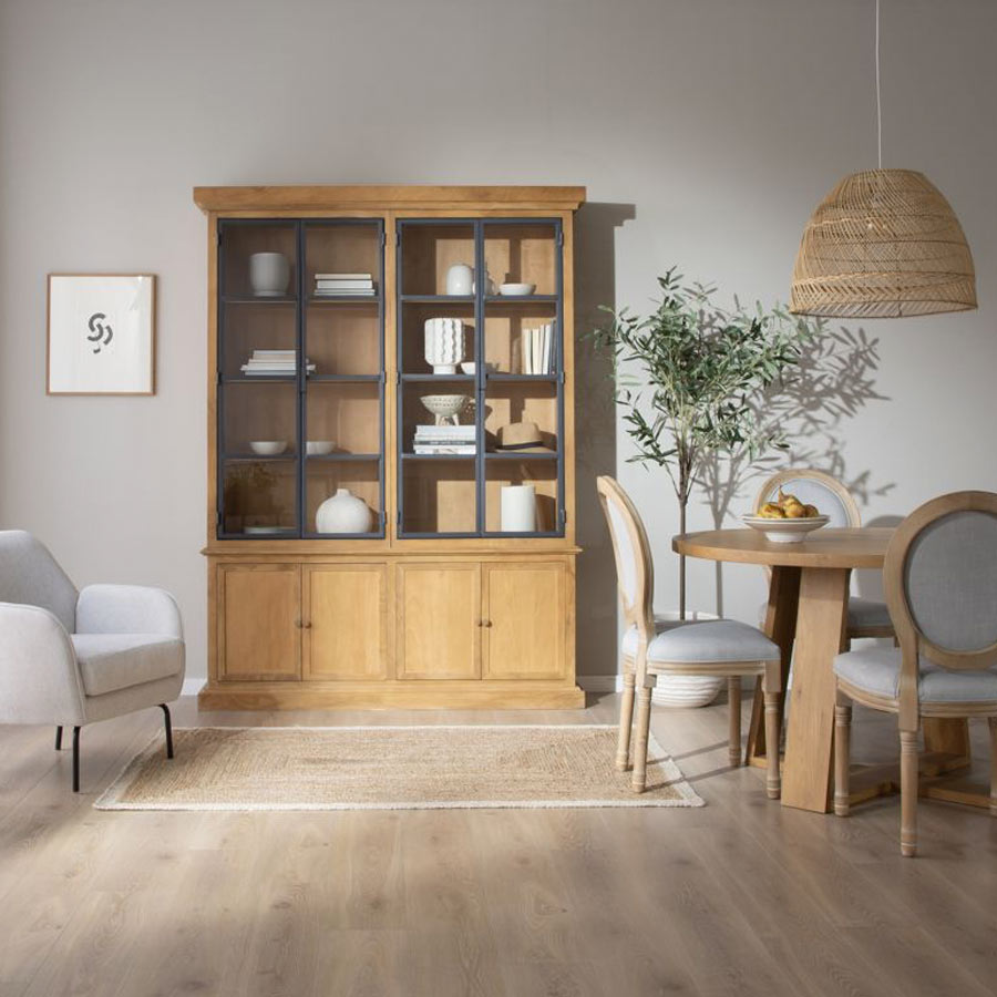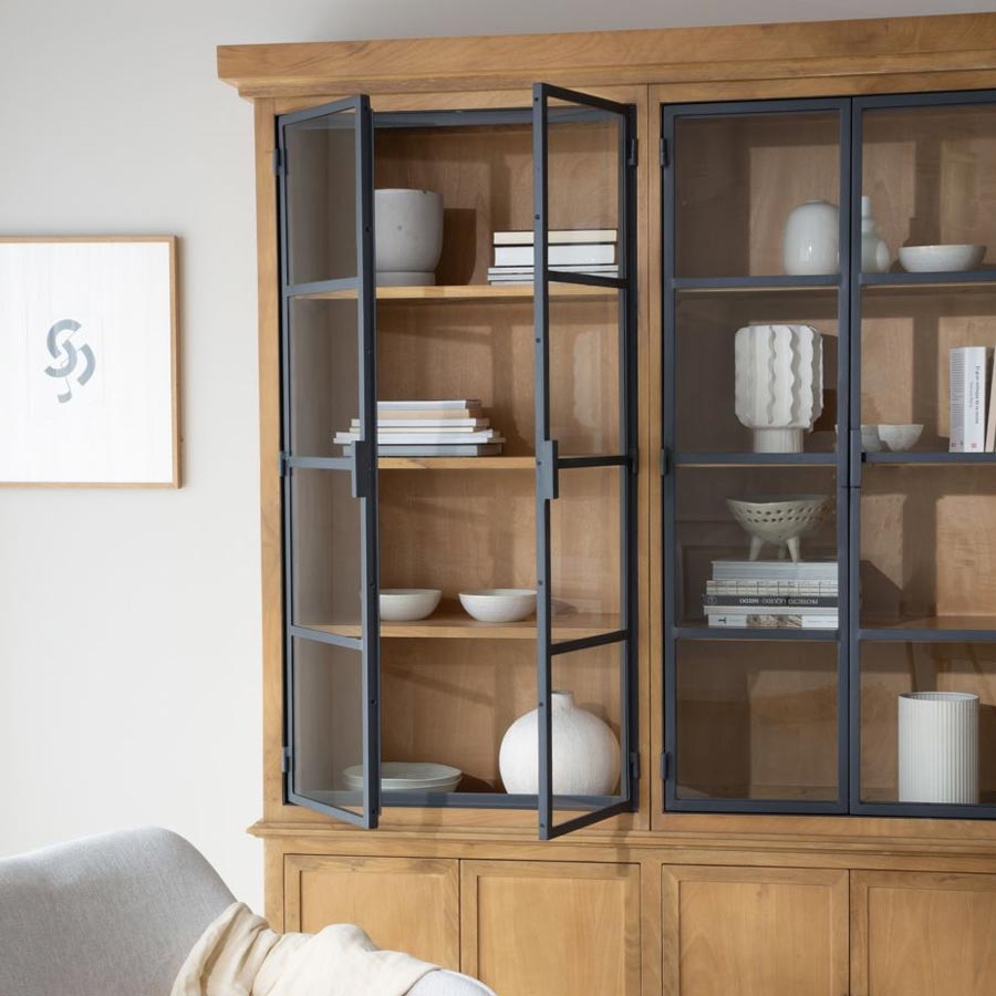 Gran vitrina con un diseño sofisticado que fusiona los estilos oriental y rústico. Está fabricada de manera artesanal con madera maciza de mango y chapa y cuenta con un marco de metal negro en las puertas acristaladas.