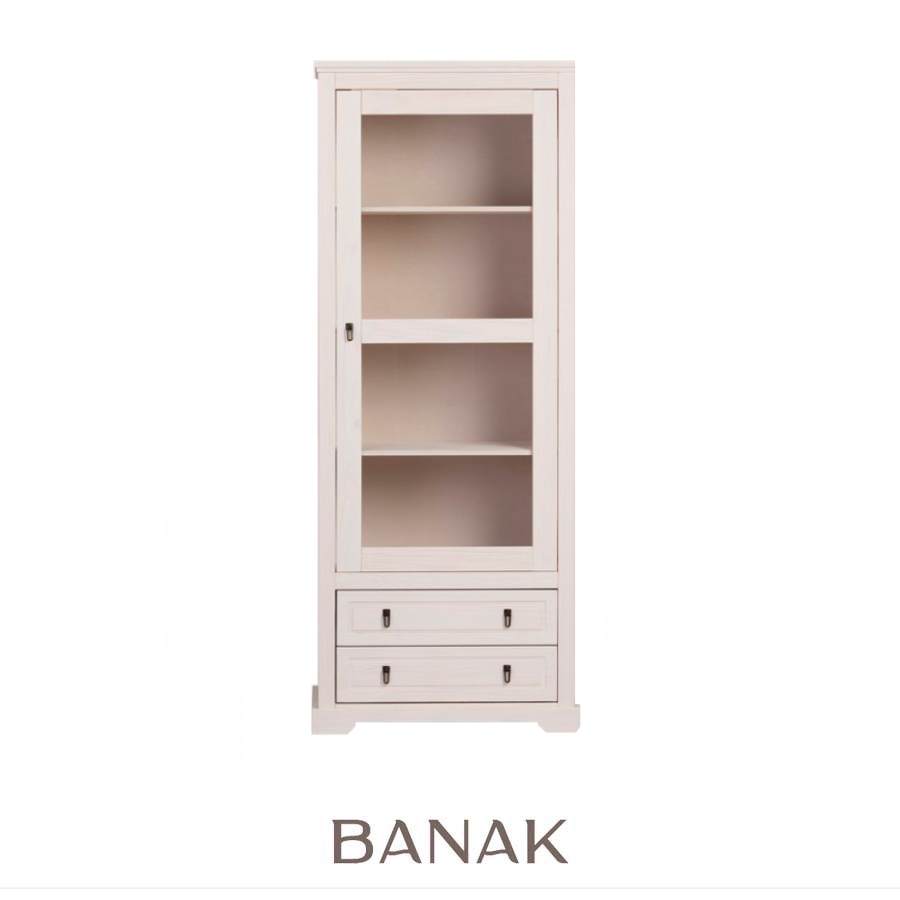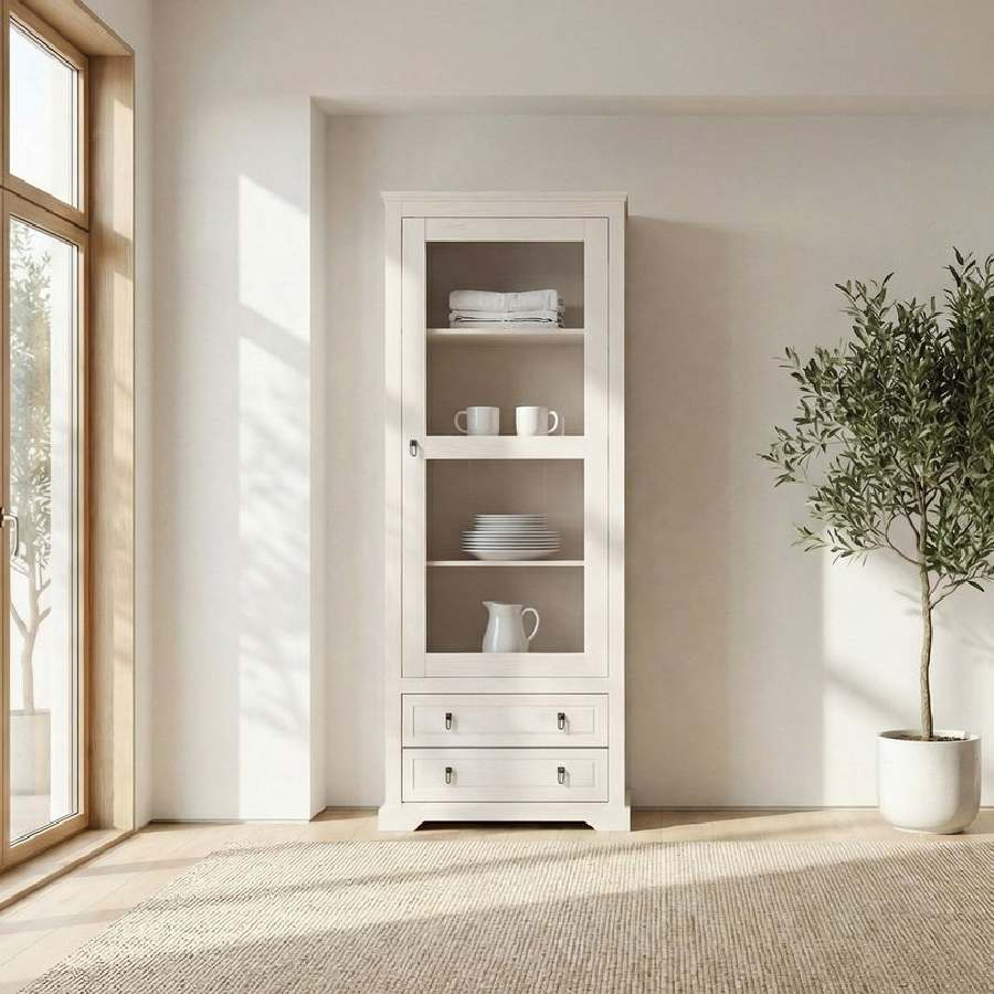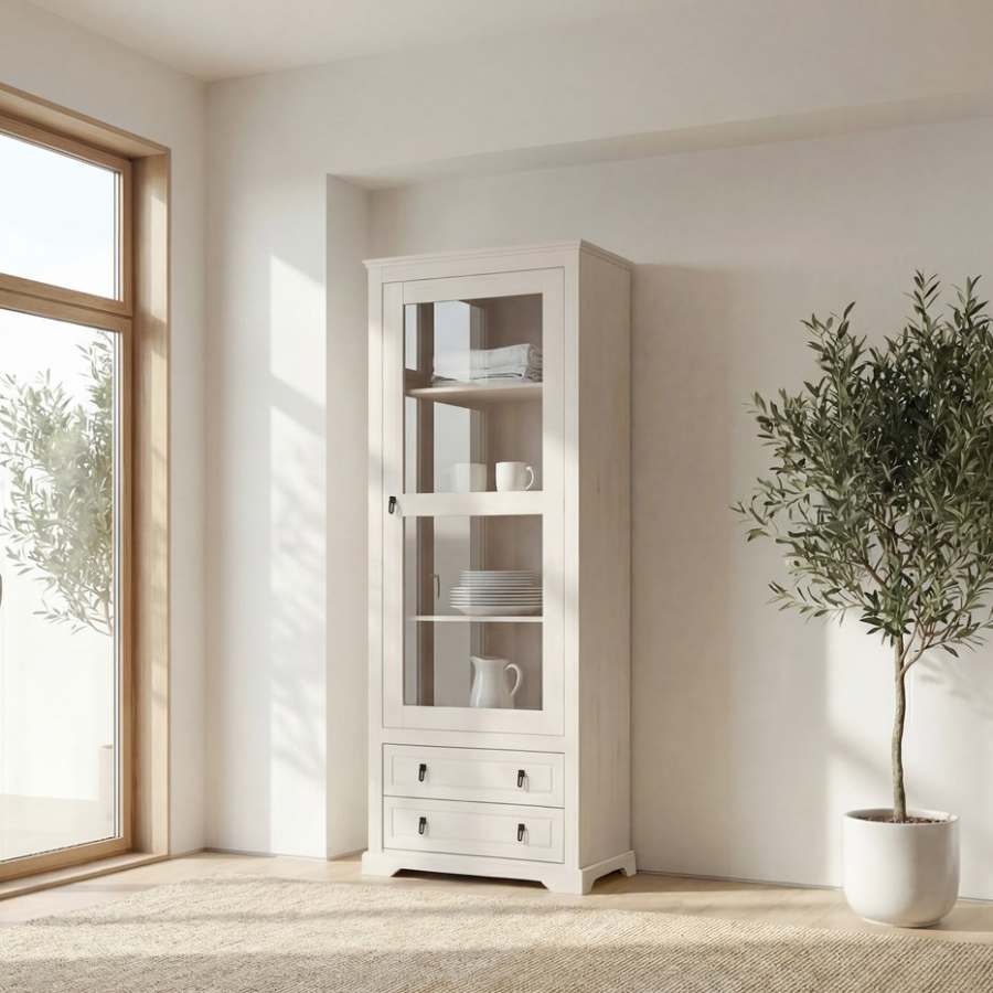Vitrina de una puerta de madera maciza con acabado en blanco lavado. Dispone de diferentes espacios de almacenamiento: una puerta con estantes y dos cajones inferiores con tiradores metálicos.
